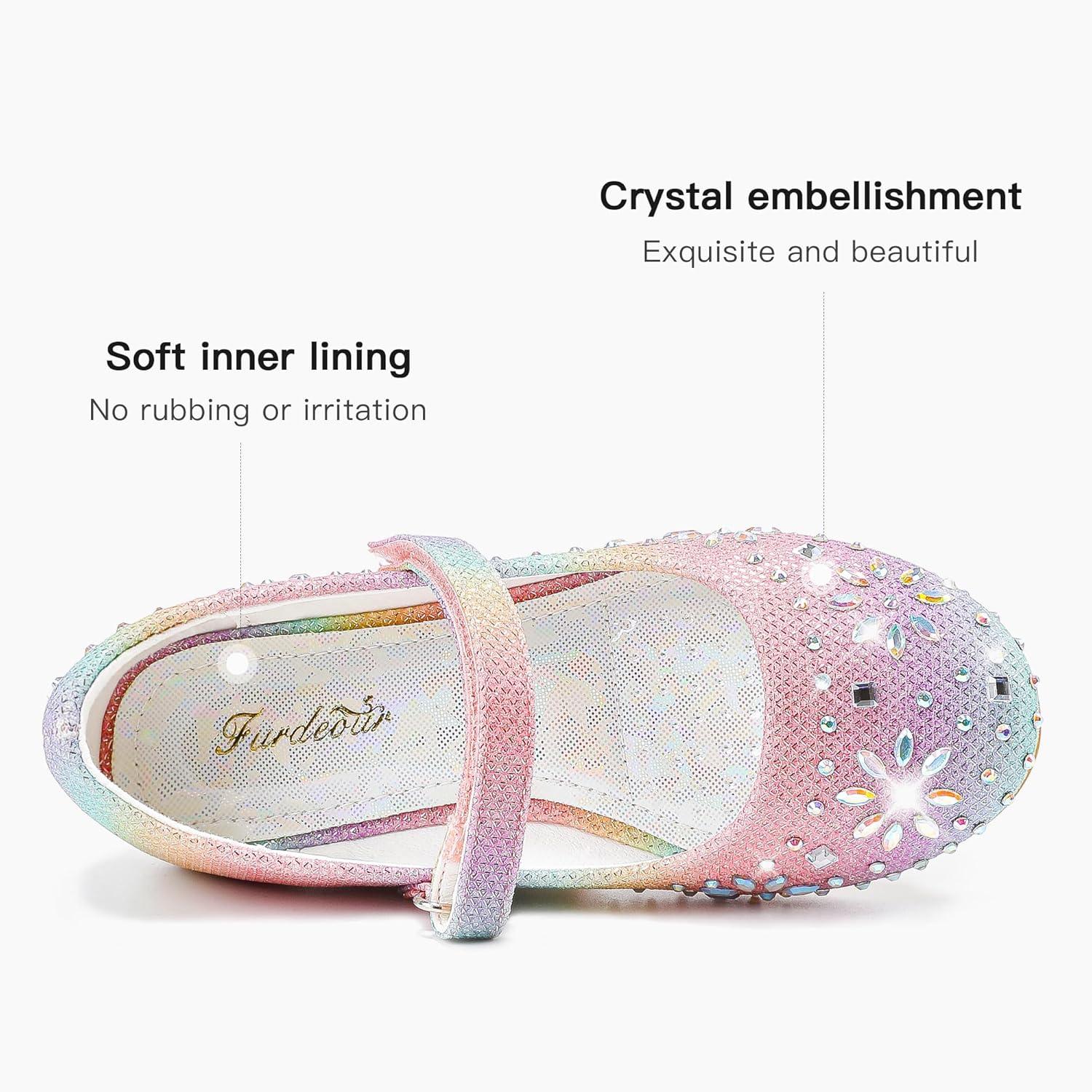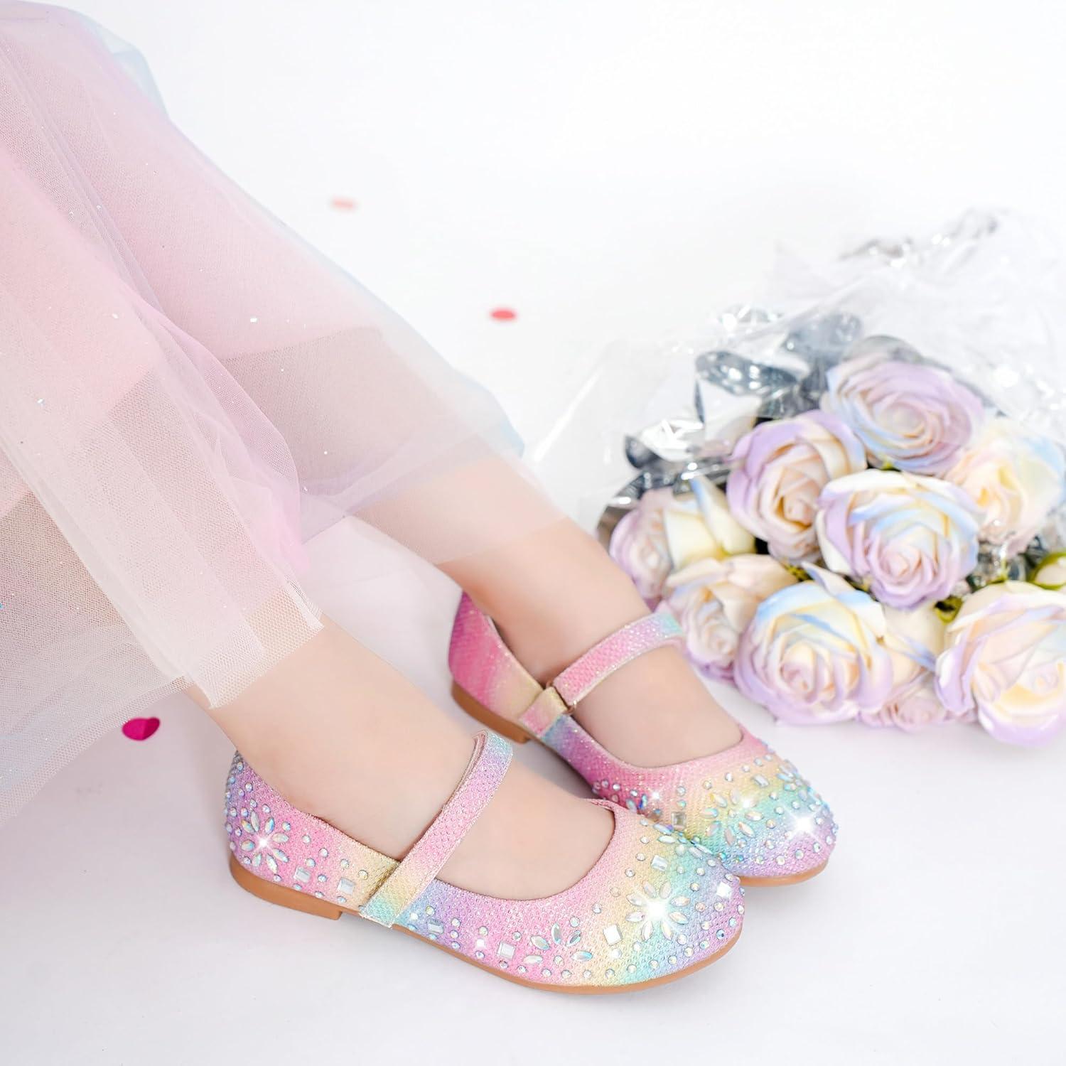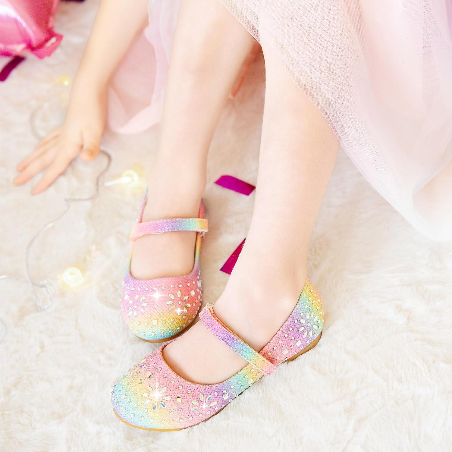 Furdeour Girls Dress Shoes Mary Jane Flower Wedding Party Bridesmaids Shoes Glitter Princess Ballet Flats for Kid Toddler(19-rainbow)