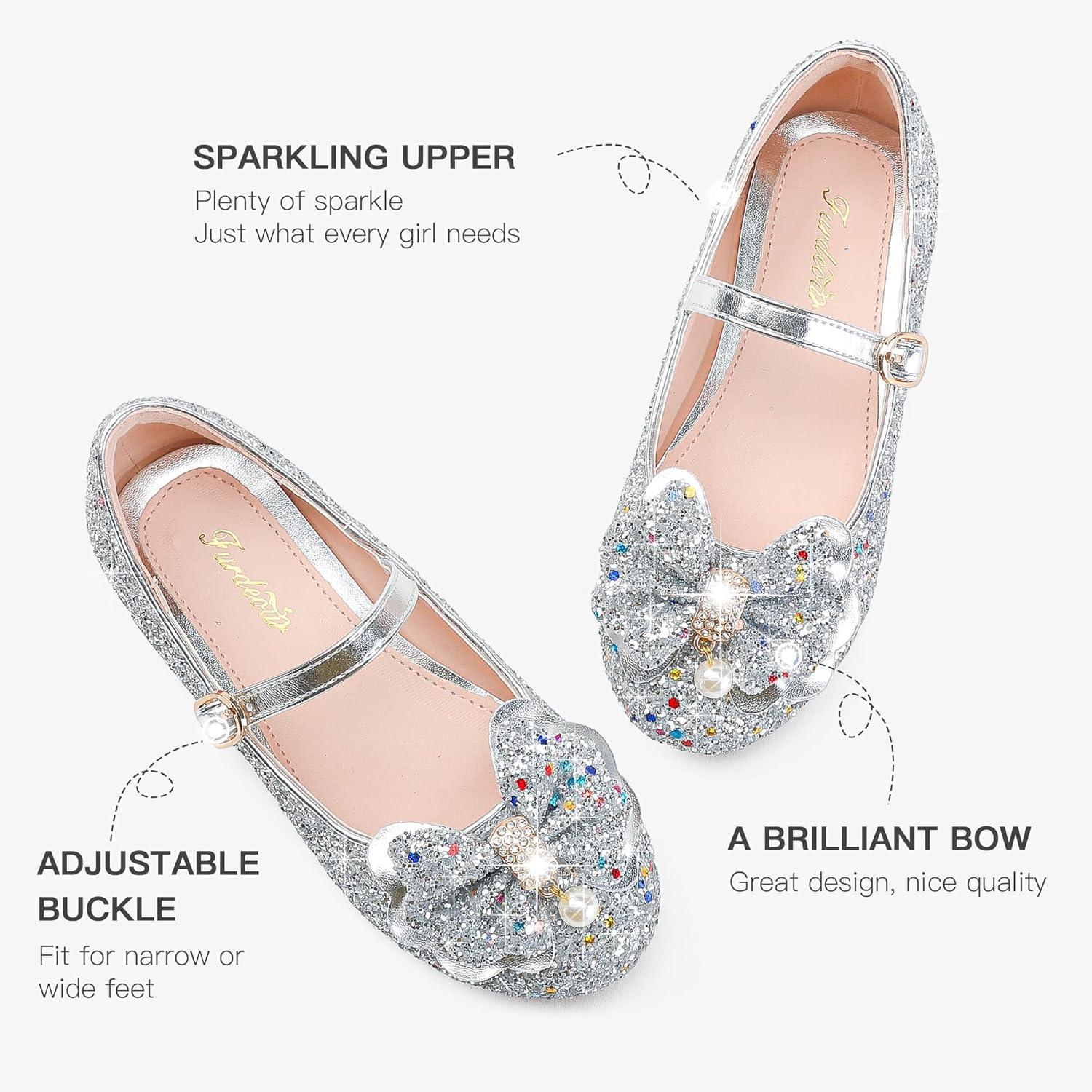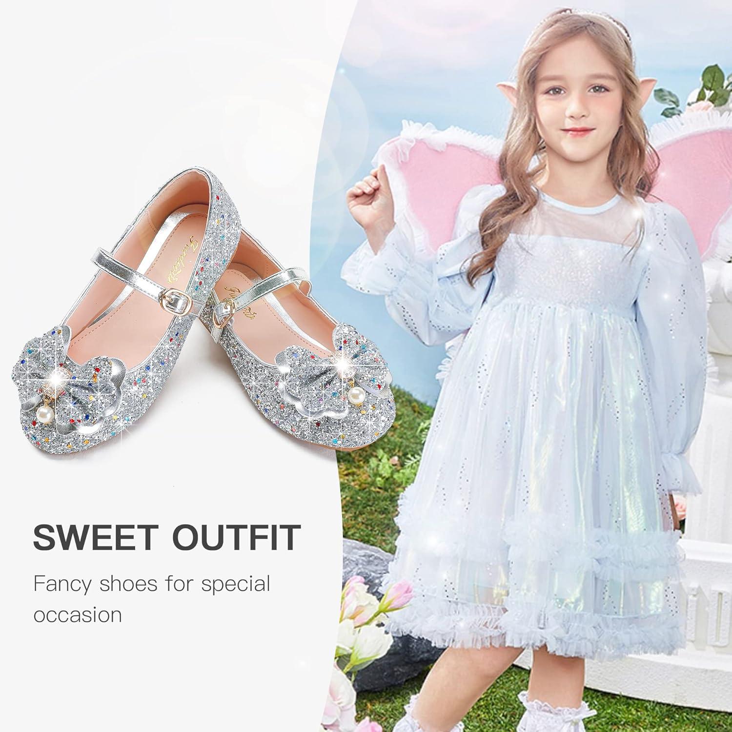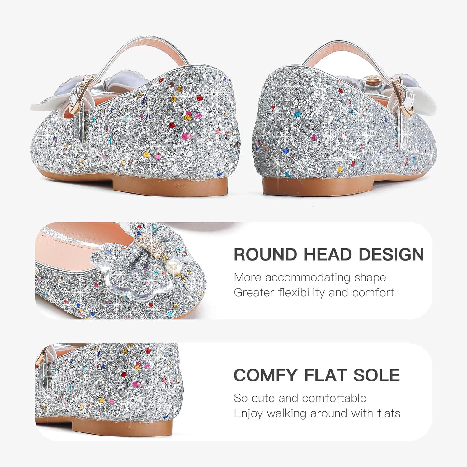 Furdeour Girls Dress Shoes Mary Jane Flower Wedding Party Bridesmaids Shoes Glitter Princess Ballet Flats for Kid Toddler(Sequin Silver)