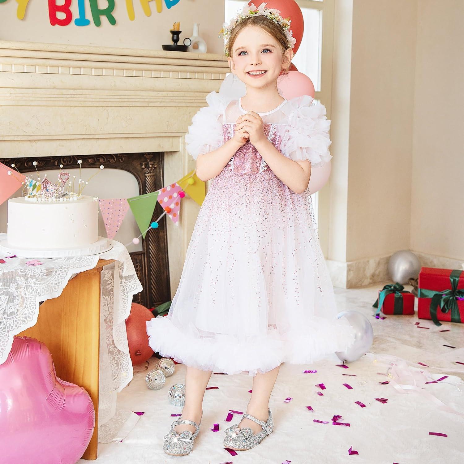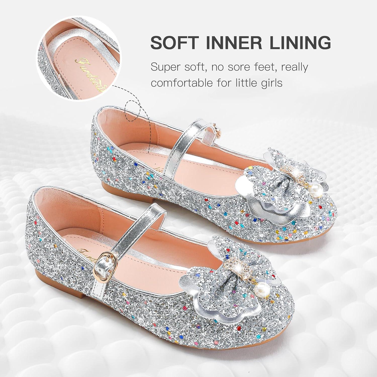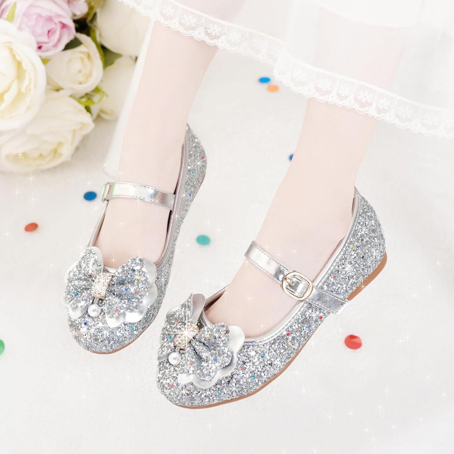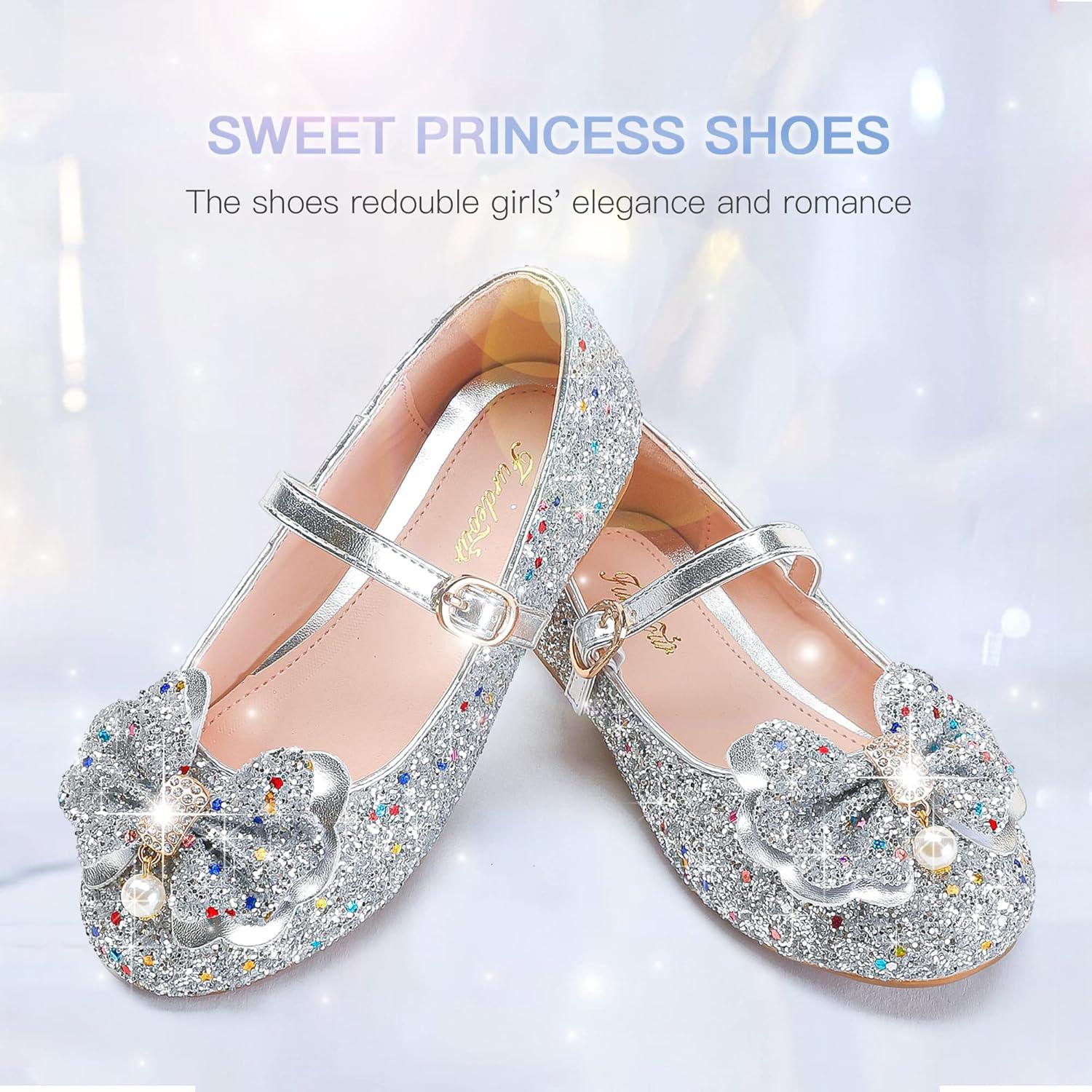 Furdeour Girls Dress Shoes Mary Jane Flower Wedding Party Bridesmaids Shoes Glitter Princess Ballet Flats for Kid Toddler(Sequin Silver)