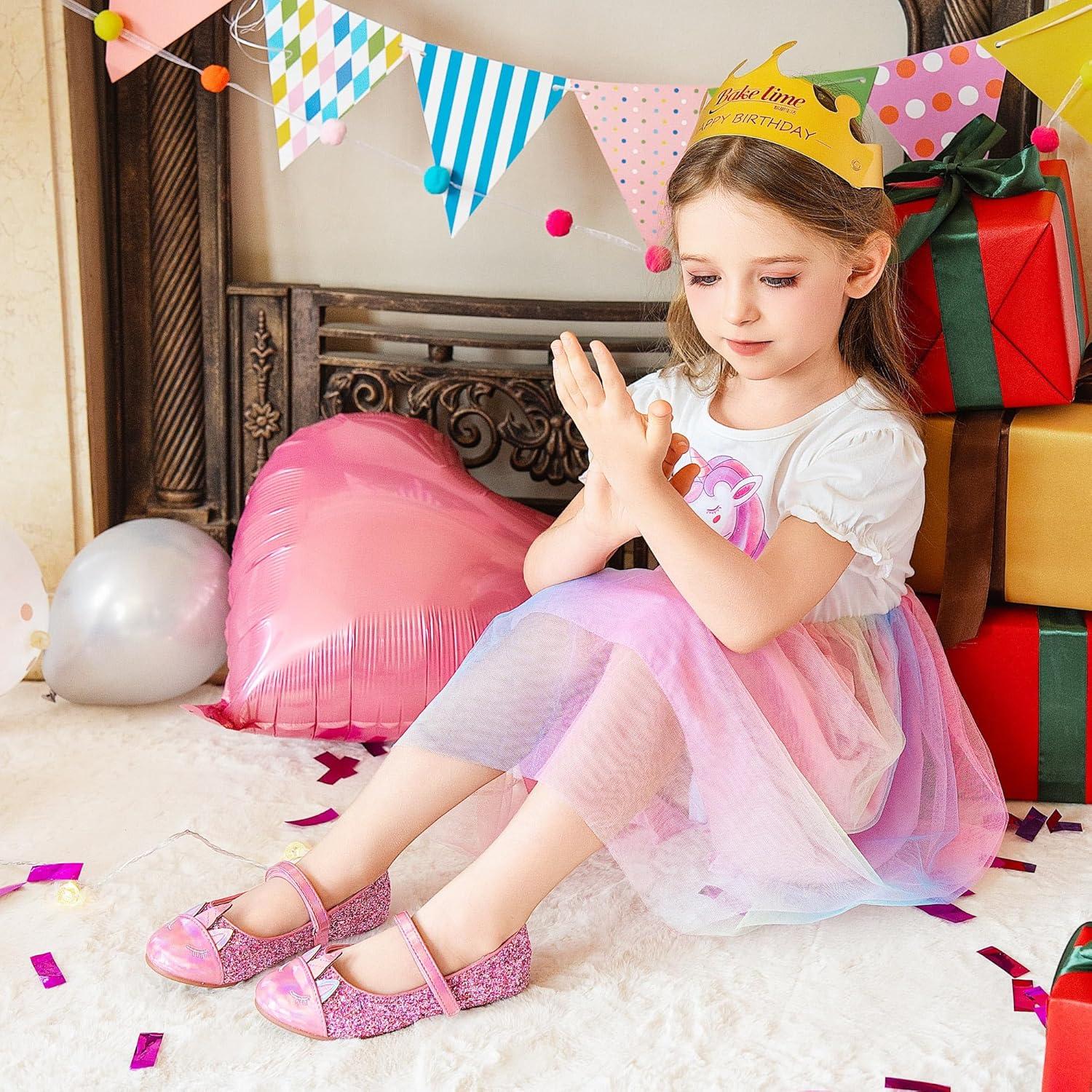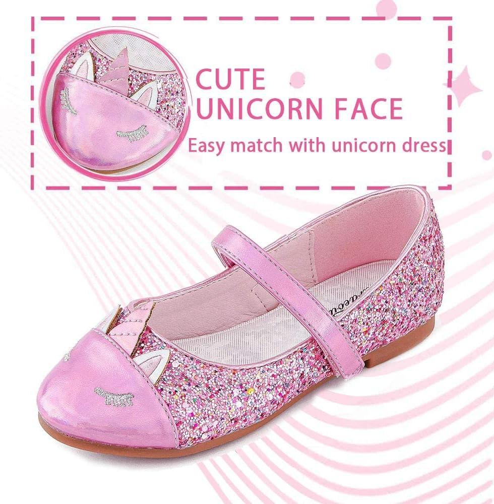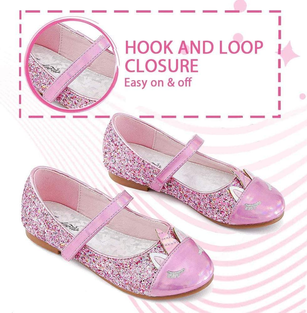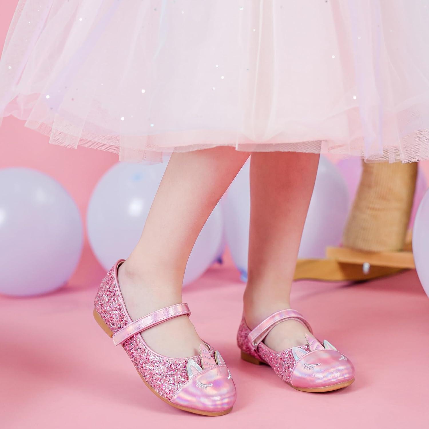 Furdeour Girls Dress Shoes Mary Jane Flower Wedding Party Bridesmaids Shoes Glitter Princess Ballet Flats for Kid Toddler(Unicorn-pink)