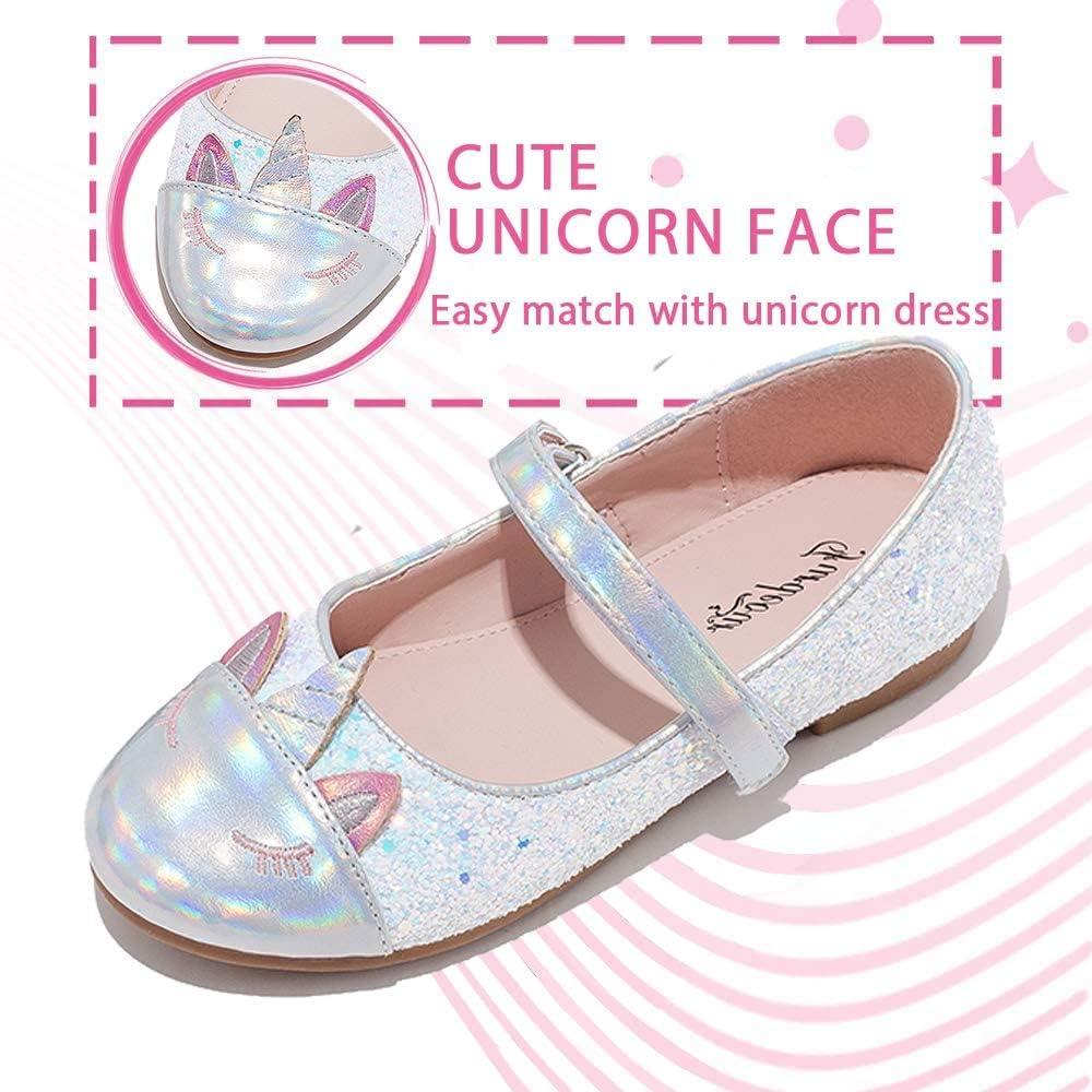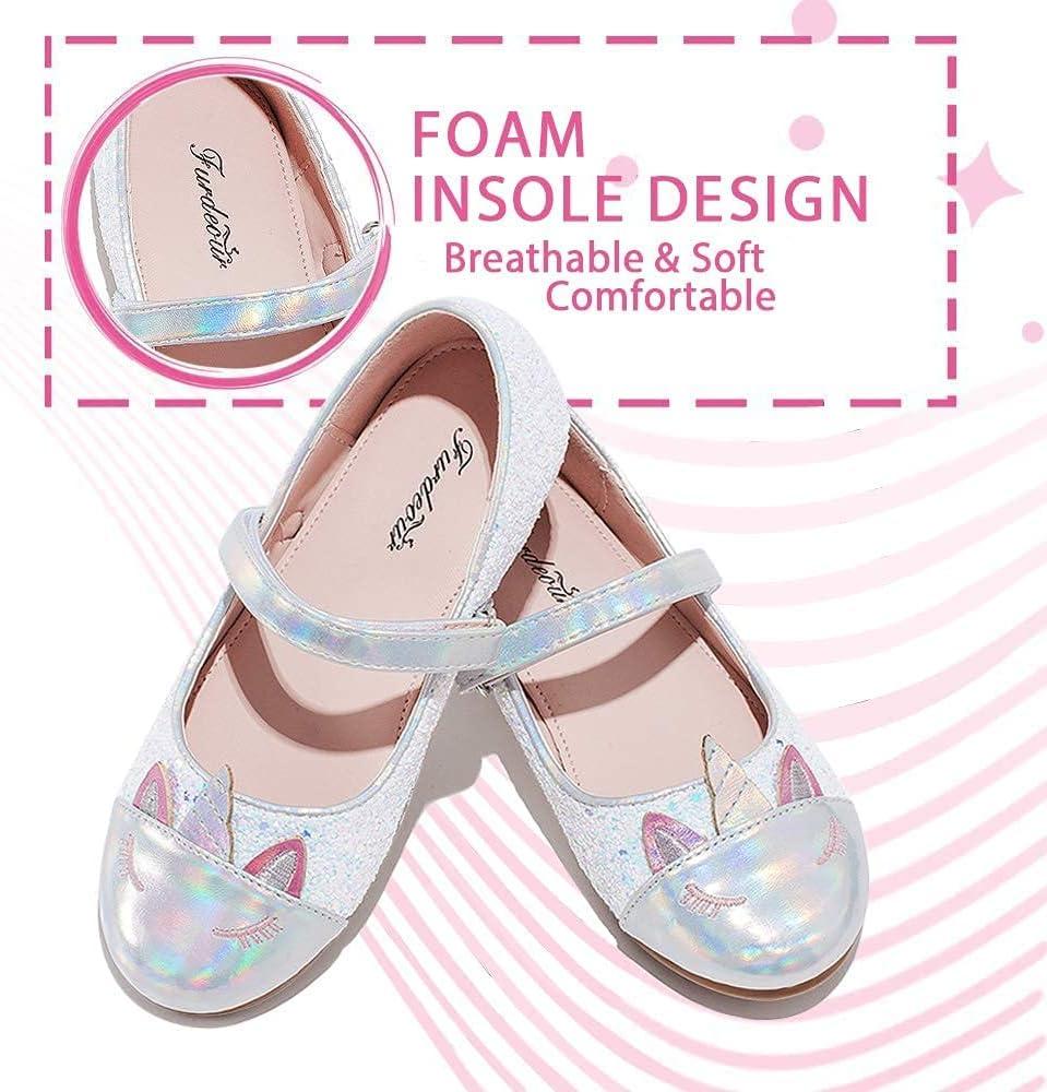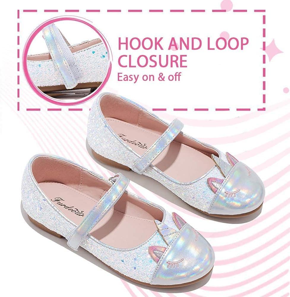 Furdeour Girls Dress Shoes Mary Jane Flower Wedding Party Bridesmaids Shoes Glitter Princess Ballet Flats for Kid Toddler(Unicorn-white)