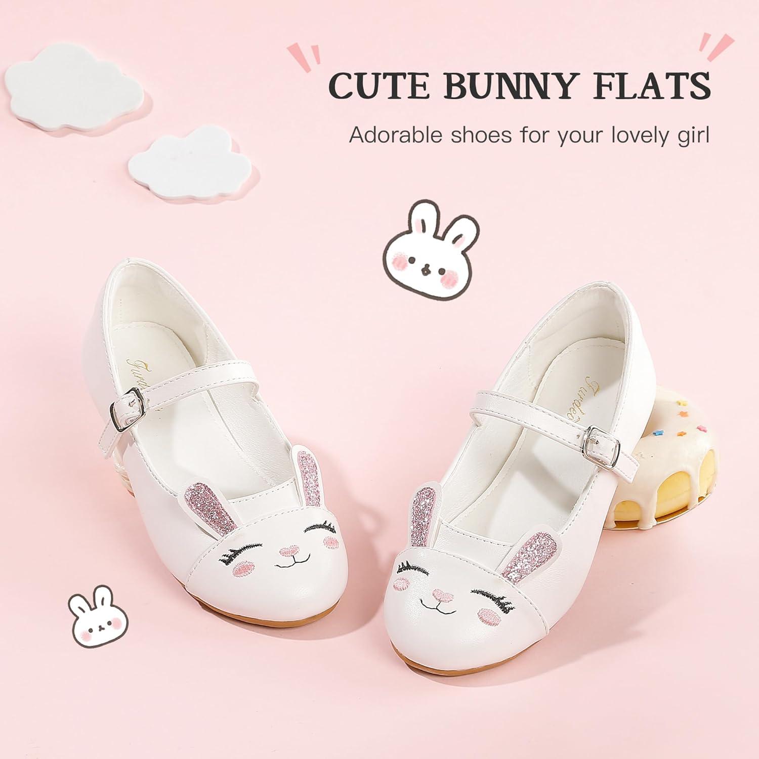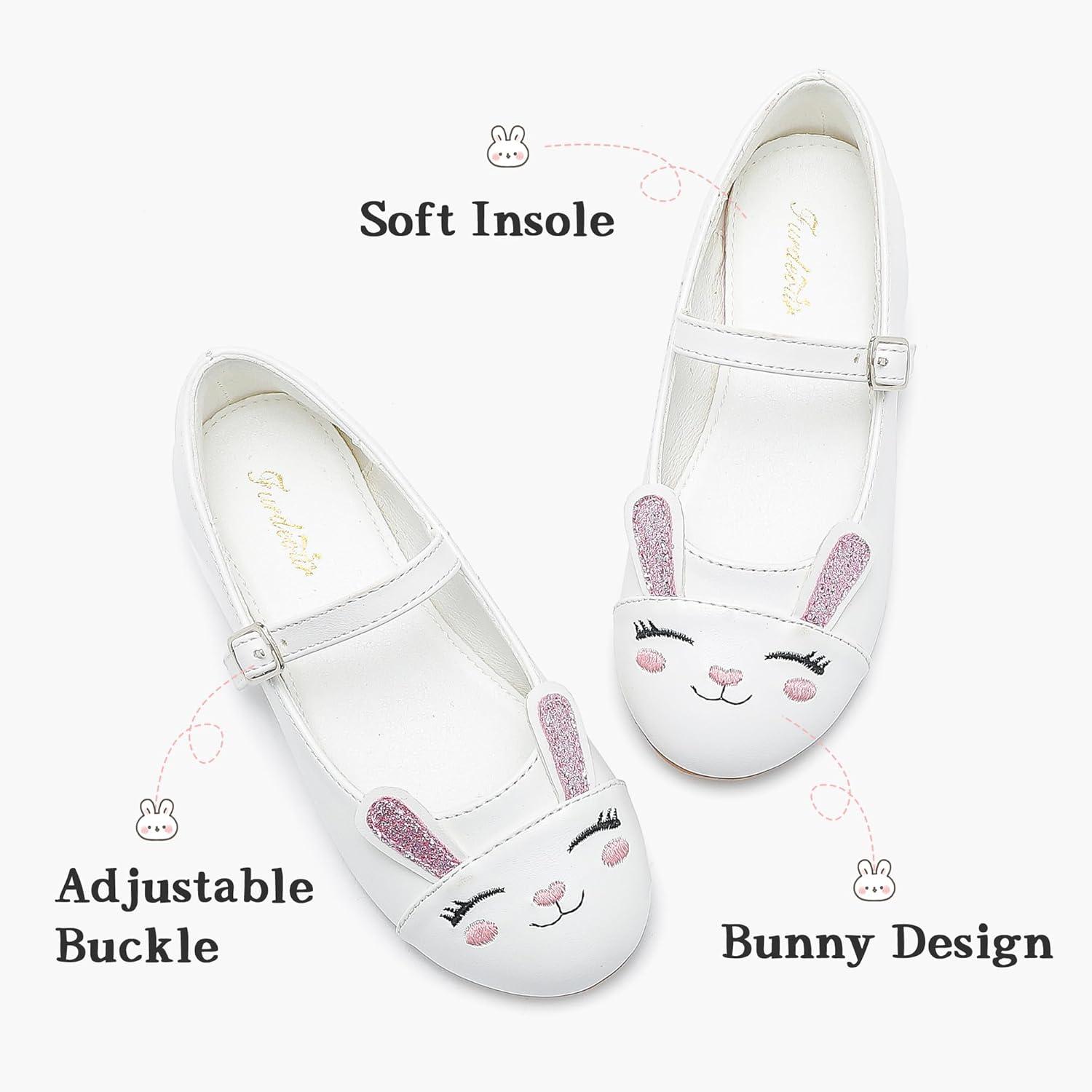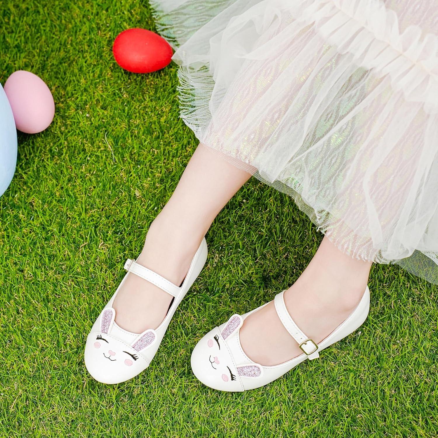 Furdeour Girls Dress Shoes Mary Jane Flower Wedding Party Bridesmaids Shoes Glitter Princess Ballet Flats for Kid Toddler(White Bunny)