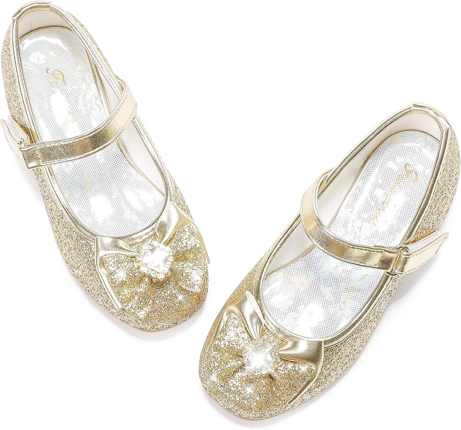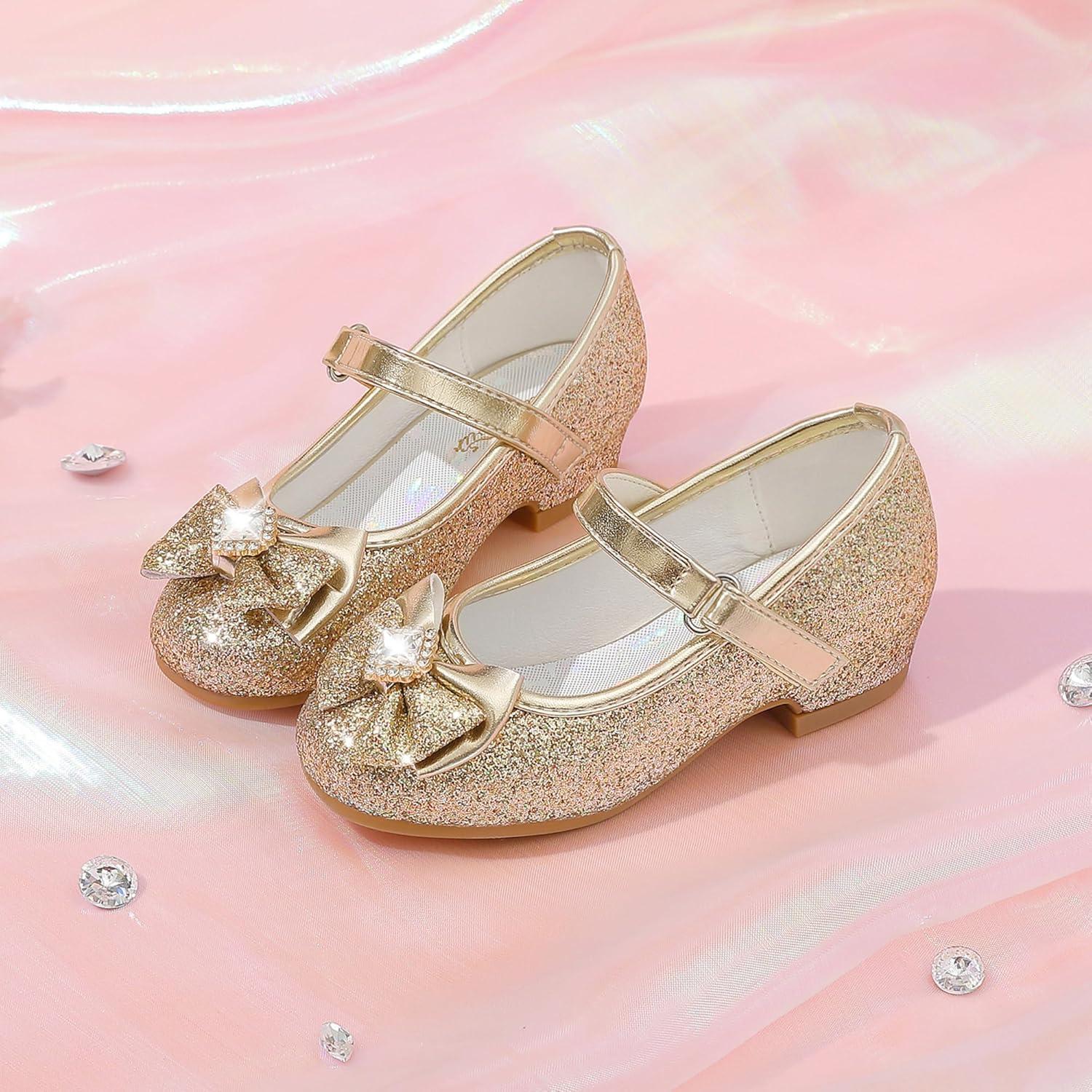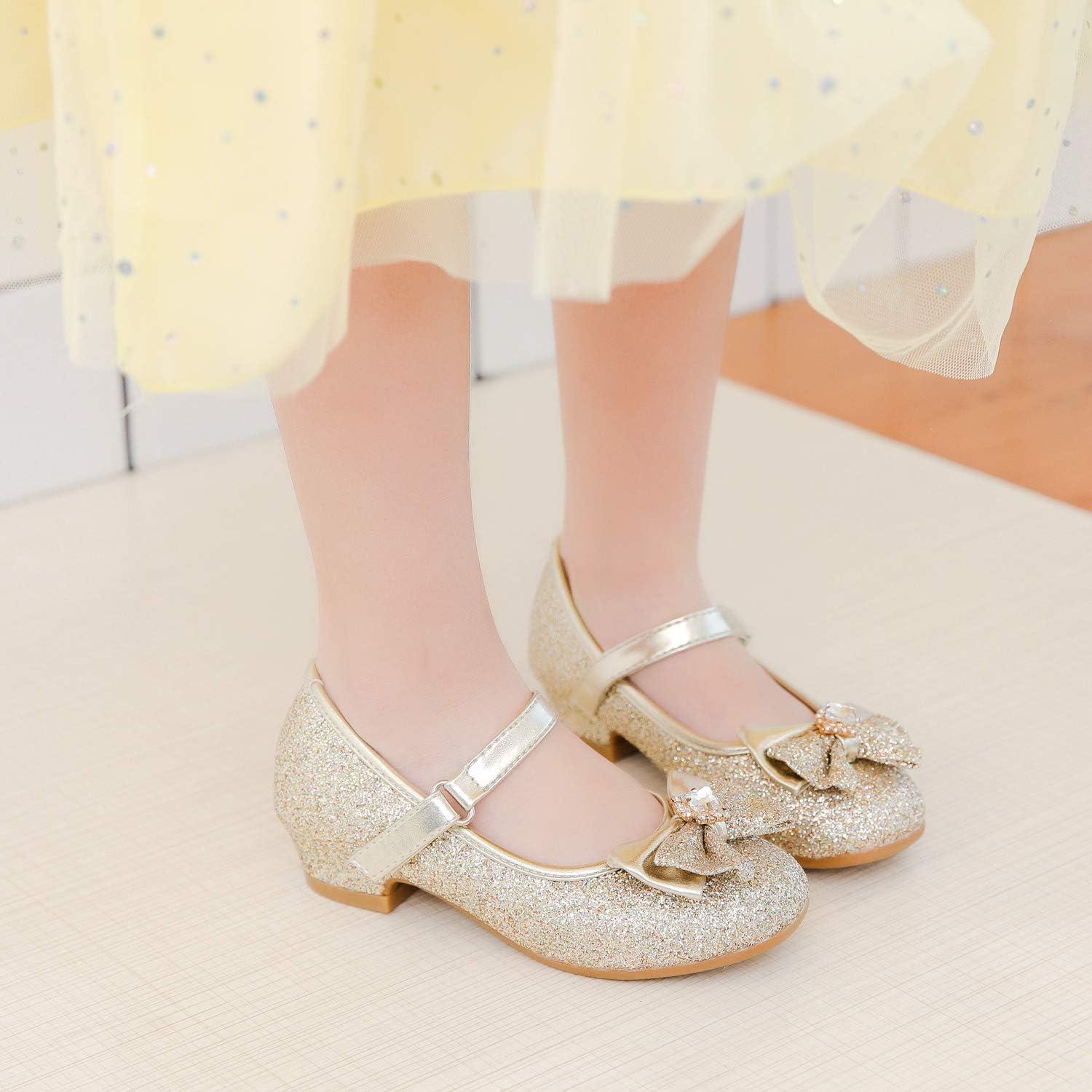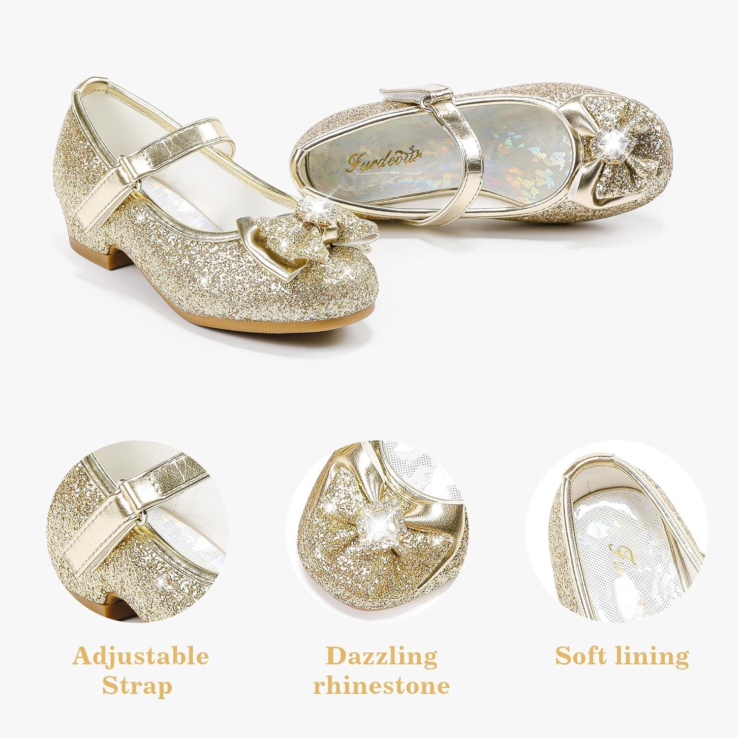 Furdeour Girls Dress Shoes Mary Jane Wedding Flower Bridesmaids Heels Glitter Princess Shoes for Kids Toddler(Gold)
