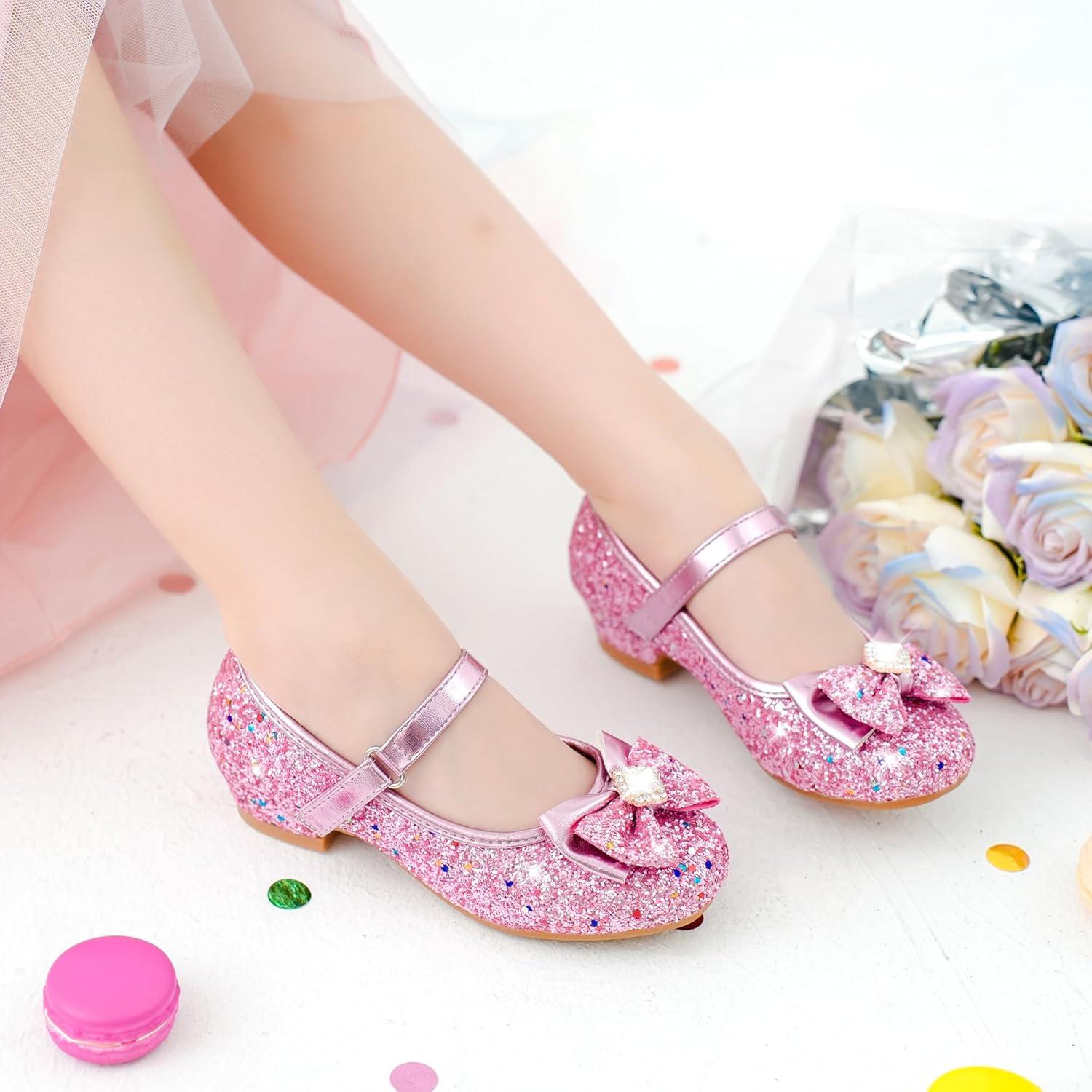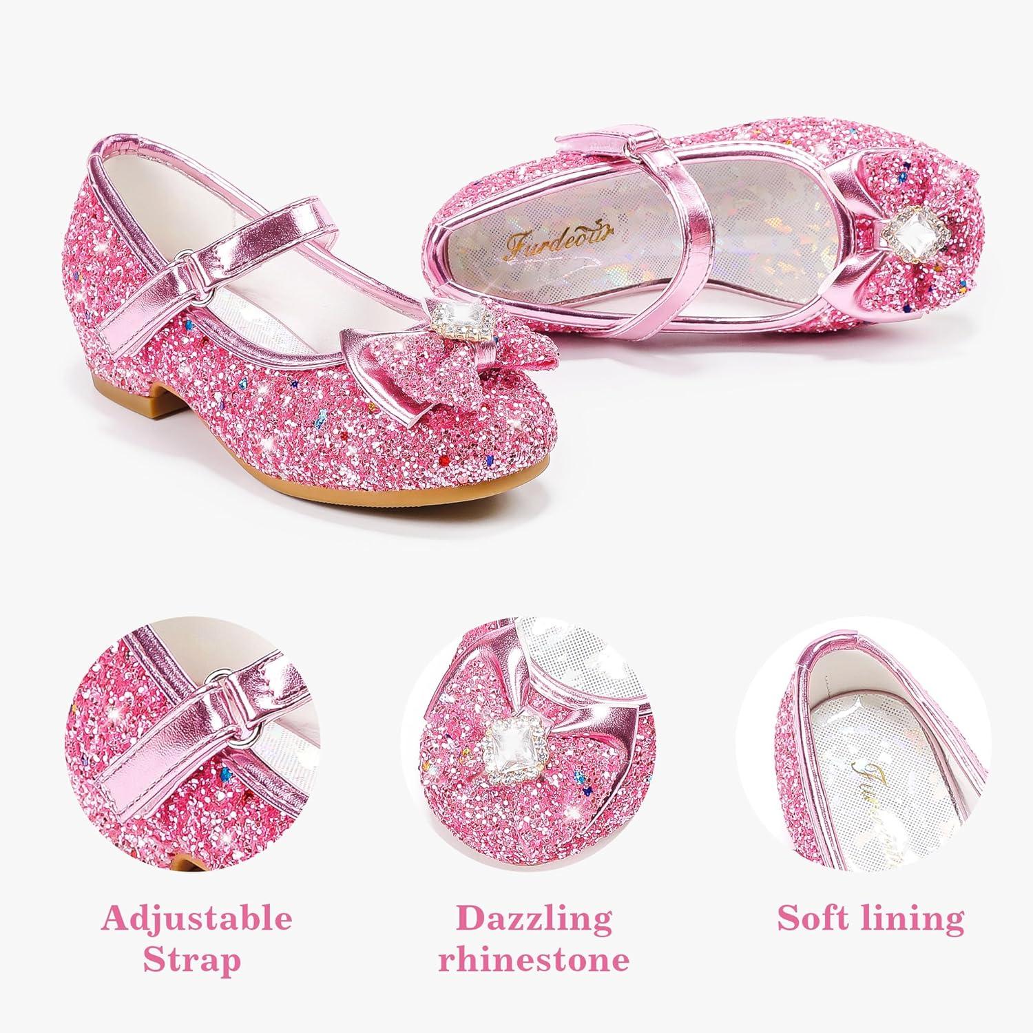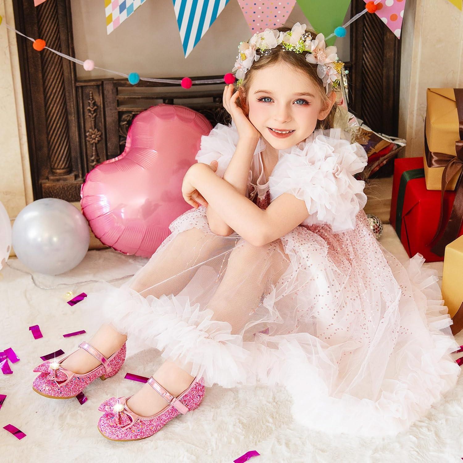 Furdeour Girls Dress Shoes Mary Jane Wedding Flower Bridesmaids Heels Glitter Princess Shoes for Kids Toddler(Sequins Pink)