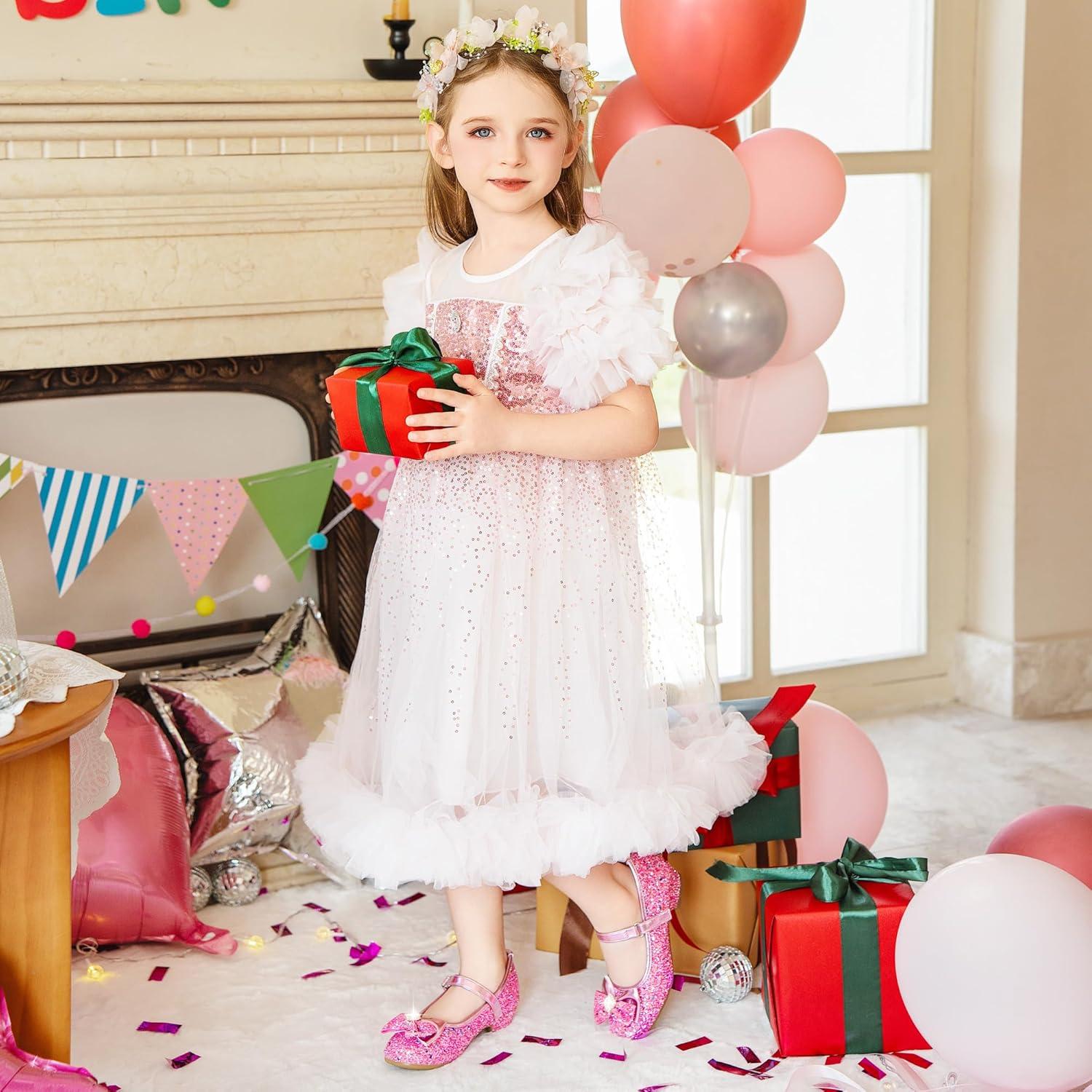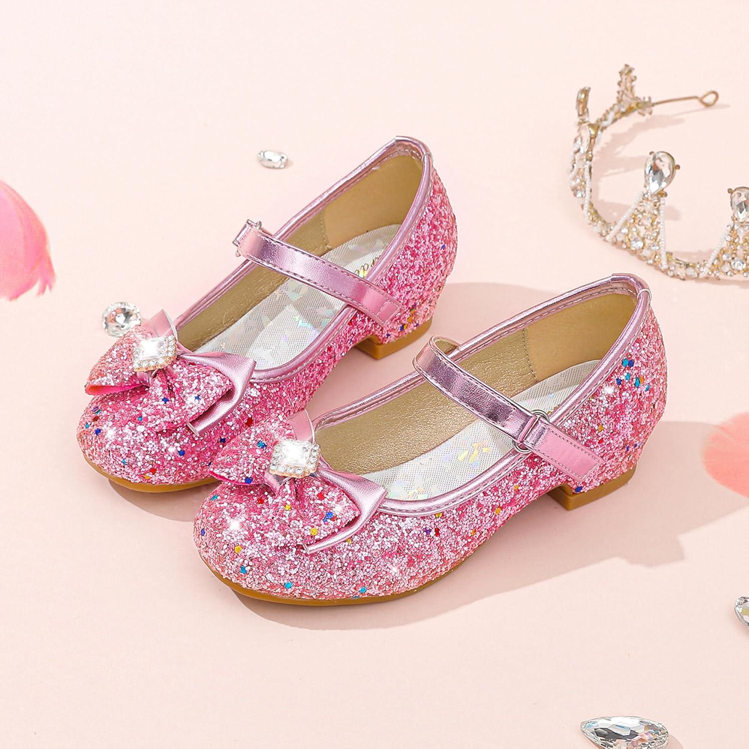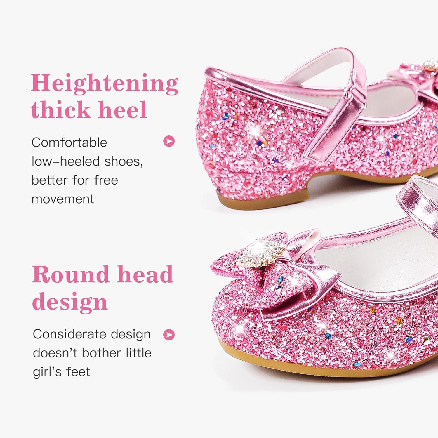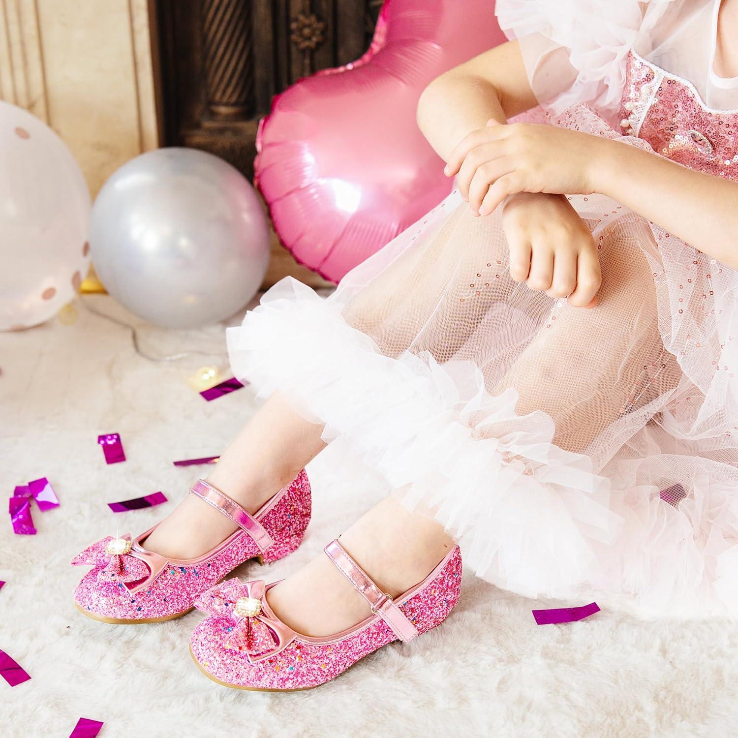 Furdeour Girls Dress Shoes Mary Jane Wedding Flower Bridesmaids Heels Glitter Princess Shoes for Kids Toddler(Sequins Pink)