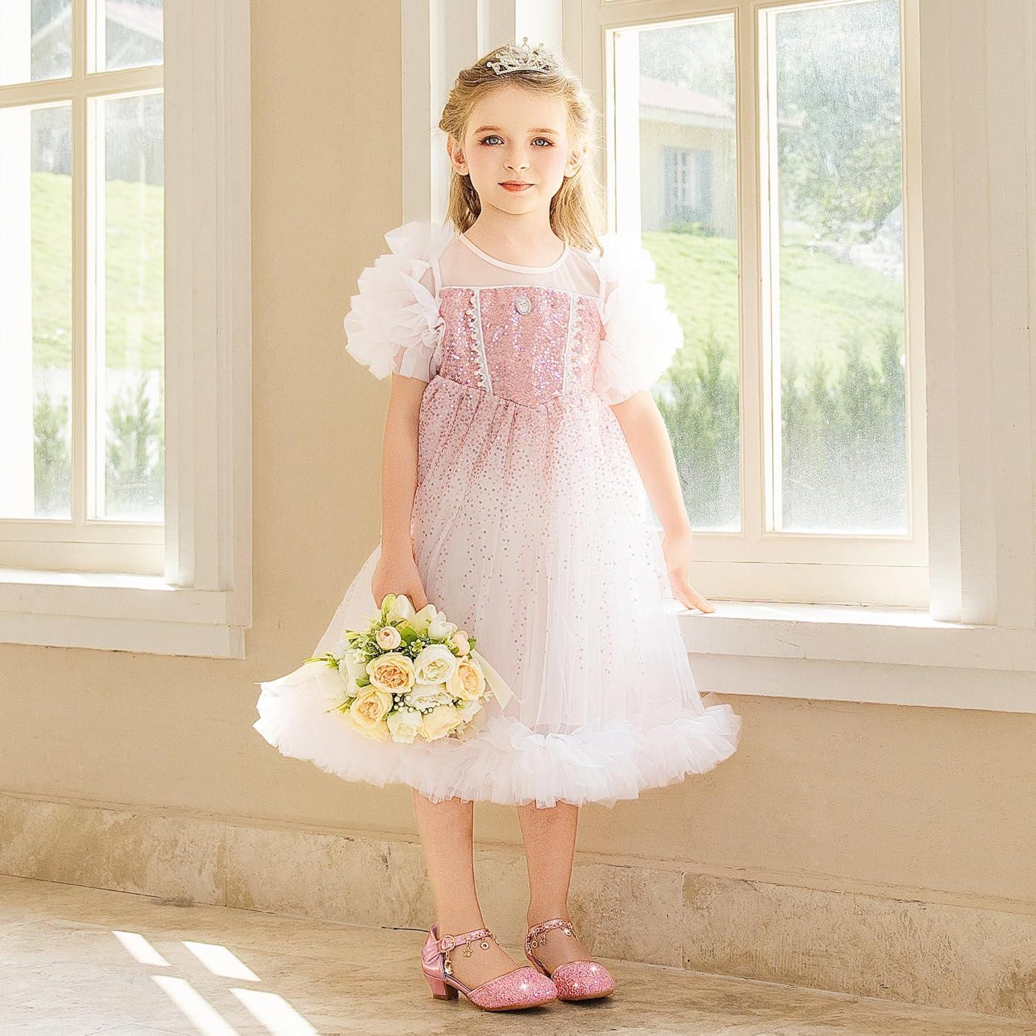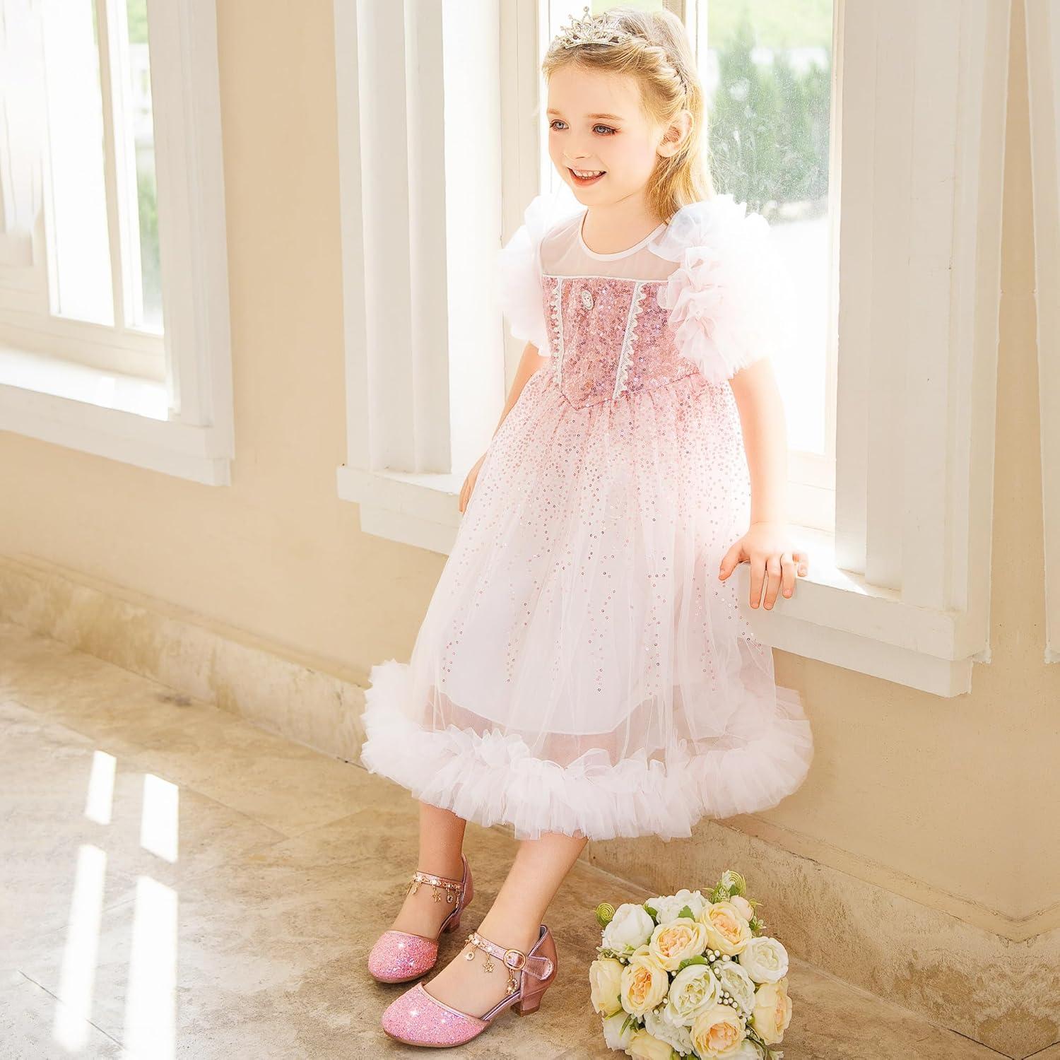 Furdeour Girls Dress Shoes Princess Crystal High Heels Closed Toe Party Wedding Flower Girls Shoes Toddler Little Big Kid(Pinkbrilliant)