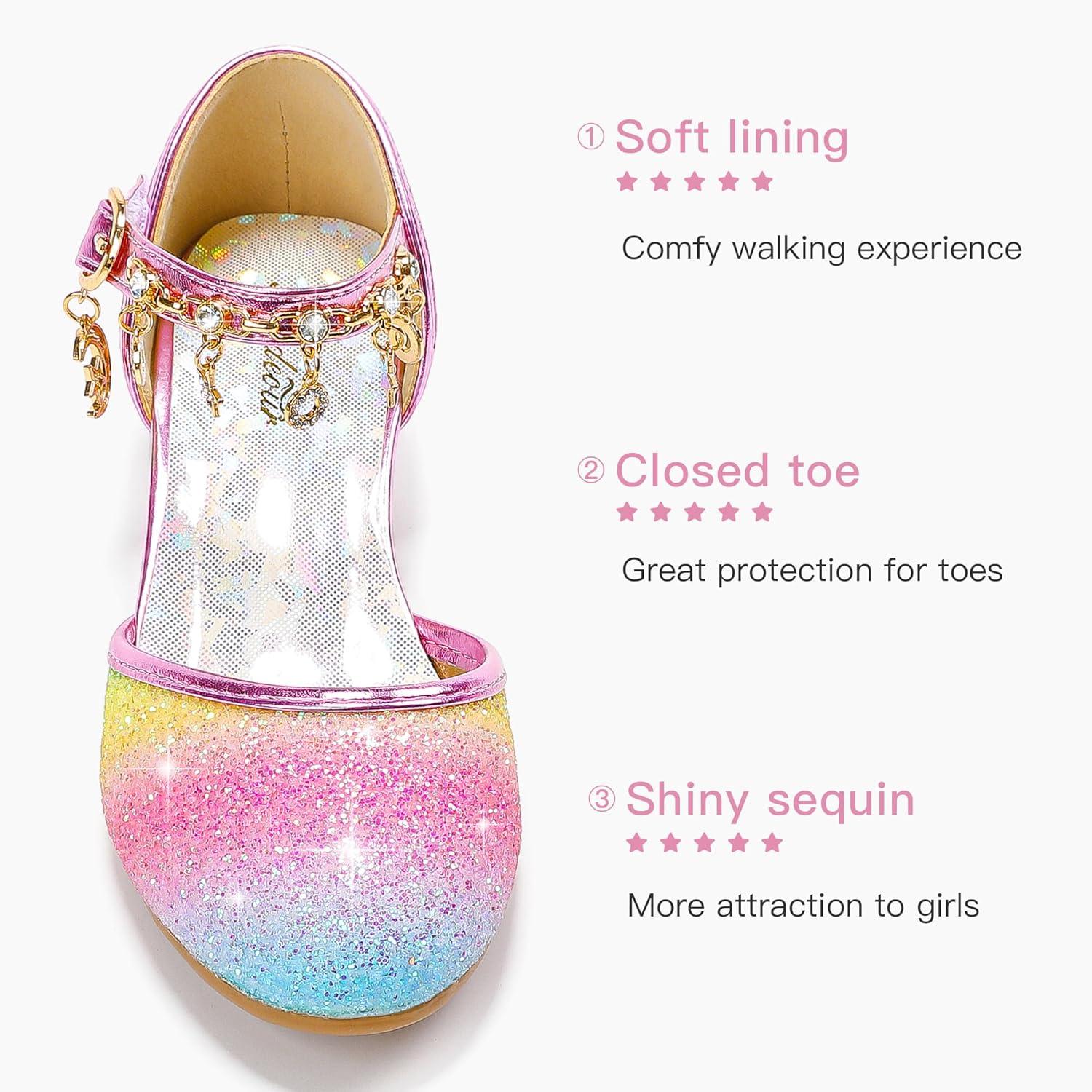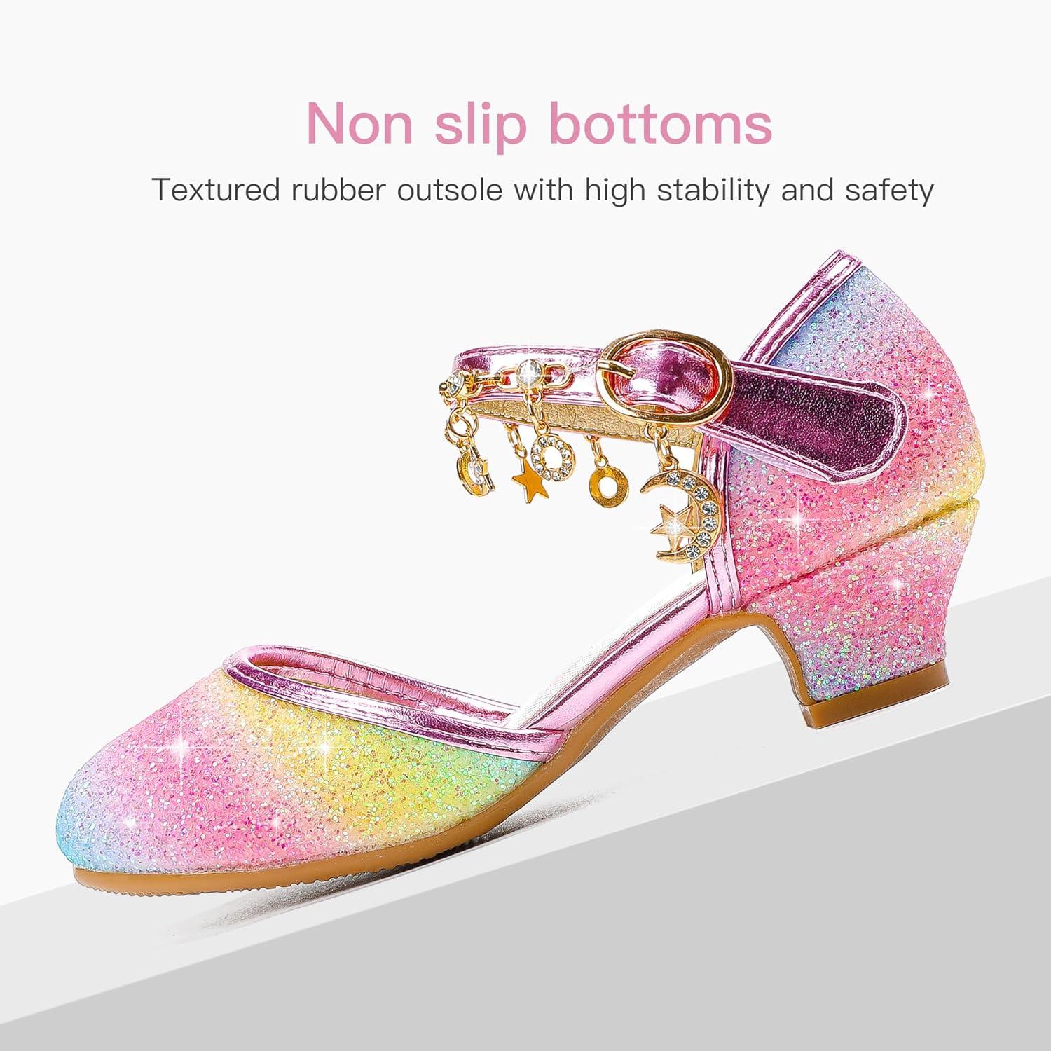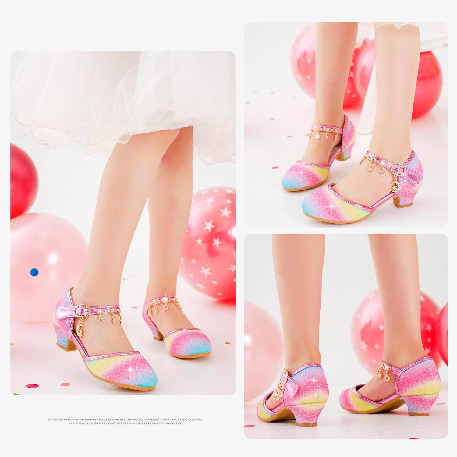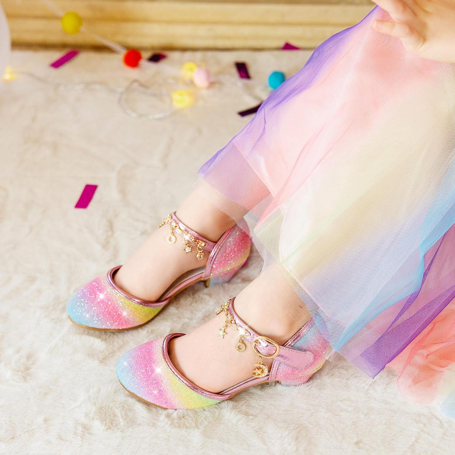 Furdeour Girls Dress Shoes Princess Crystal High Heels Closed Toe Party Wedding Flower Girls Shoes Toddler Little Big Kid(Rainbowpendant)